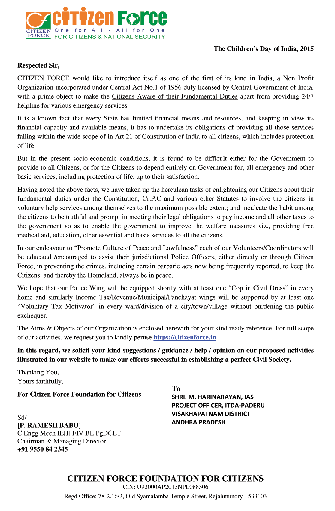 Letter submitted to Shri. M. HARINARAYAN, IAS, Project Officer, ITDA-PADERU.