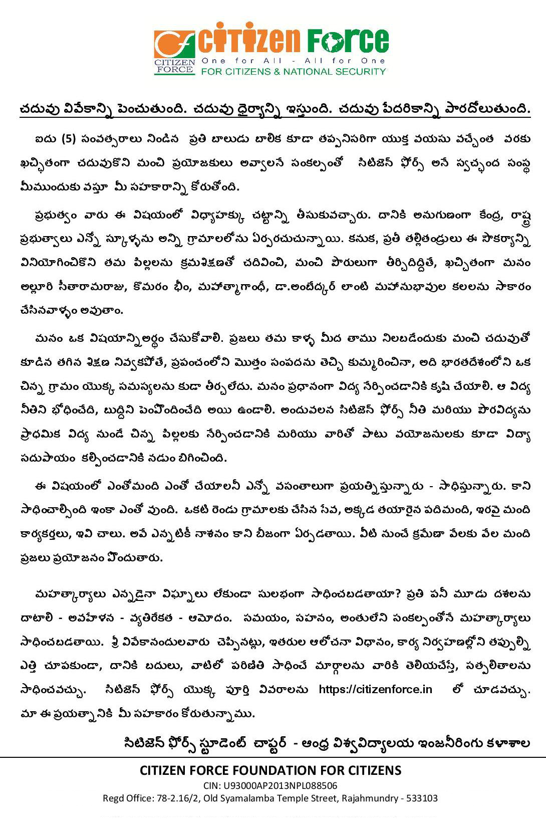 Importance of Child Education - Pamphlet in Telugu distributed by Student Chapter